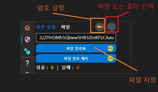 사용하는 방법은 주로 두번째 아이콘인 방패 아이콘을 눌러 작업을 진행하는 데 무료 버전은 파일만 암호화가 가능한 것으로 보입니다.