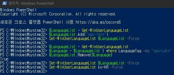 위의 스크립트는 언어 목록을 모두 제거하고 기본 언어로 초기화하는 스크립트입니다. 모두 드래그하여 파워셀창에 붙여넣기한 다음 엔터 합니다.