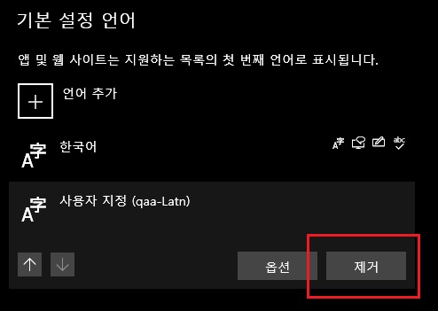 이 작업이 끝나면 파워셀 창을 닫고 윈도우 설정 > 시작 및 언어 > 언어 경로로 들어간 다음 언어 목록의 하단에 있는 알 수 없는 로캘(qaa-Latn)을 누른 다음 제거 버튼을 클릭합니다.