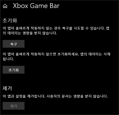 윈도우 설정 > 앱 > 앱 및 기능 > Xbox Game Bar를 누른 다음 고급 옵션을 클릭합니다. 복구 및 초기화를 눌러준 다음 PC를 재시작하고 오류가 수정되었는지 시도해 봅니다.
