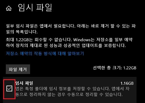 윈도우 설정 > 시스템 > 저장소 > 임시 파일로 들어갑니다. 다른 항목들은 삭제 여부가 상관없으나 임시 파일 항목은 반드시 선택되도록 한 다음 파일 제거 버튼을 눌러 정리합니다.