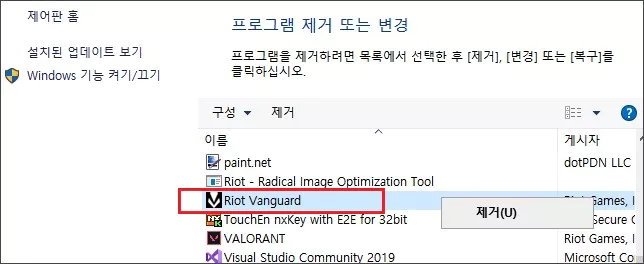 제어판의 프로그램 및 기능에서 Riot Vanguard를 제거한 다음 발로란트를 실행해 다시 설치하시기 바랍니다. 이후 발로란트 실행 시에 여전히 문제가 해결되지 않았다면 다음 단계로 넘어갑니다.