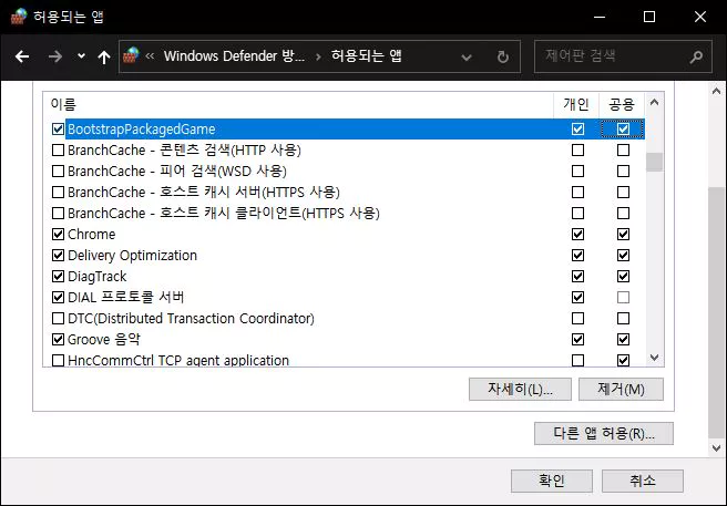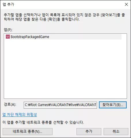 위의 허용되는 앱 창에서 우측 하단의 다른 앱 허용 버튼을 누릅니다. 이번에는 위에서 언급한 경로에 있는 VALORANT.exe를 지정해 줍니다. 발로란트를 추가 앱으로 지정해 주면 실제 이름은 BootstrapPackagedGame라는 이름으로 바뀌어 등록됩니다. 하단의 추가 버튼을 눌러 추가해줍니다.