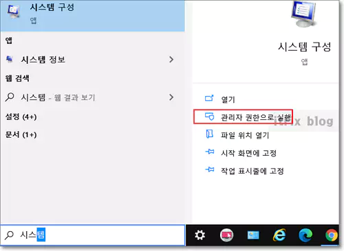 윈도우 작업표시줄의 검색상자에 시스템이라고 입력하면 위쪽으로 시스템 구성이 나옵니다. 관리자 권한으로 시스템 구성을 실행합니다.