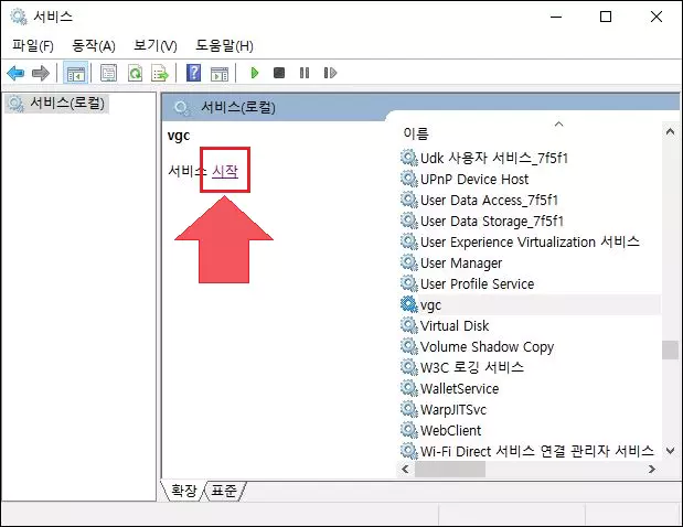서비스 앱의 목록 창에서 스크롤바를 아래로 내려 vgc 항목을 찾습니다.