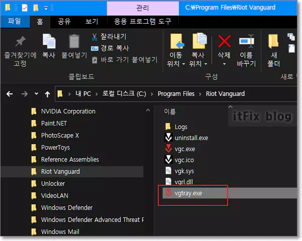 이제 PC를 재시작한 다음 파일 탐색기를 열고 C:\Program Files 경로로 들어간 다음 하위 폴더로 있는 Riot Vanguard 폴더를 우클릭하여 통째로 삭제합니다.