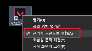 이제 파일 탐색기를 닫고 바탕화면에 있는 발로란트 아이콘을 마우스로 우클릭하고 관리자 권한으로 실행을 눌러 줍니다.