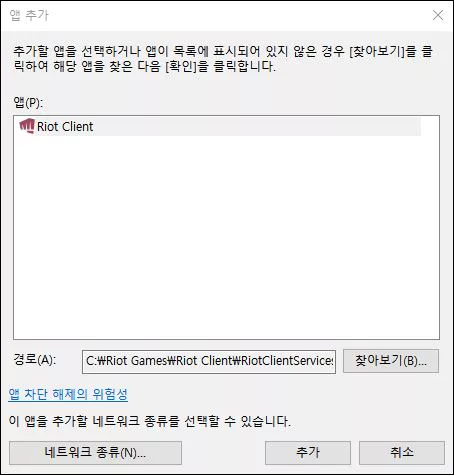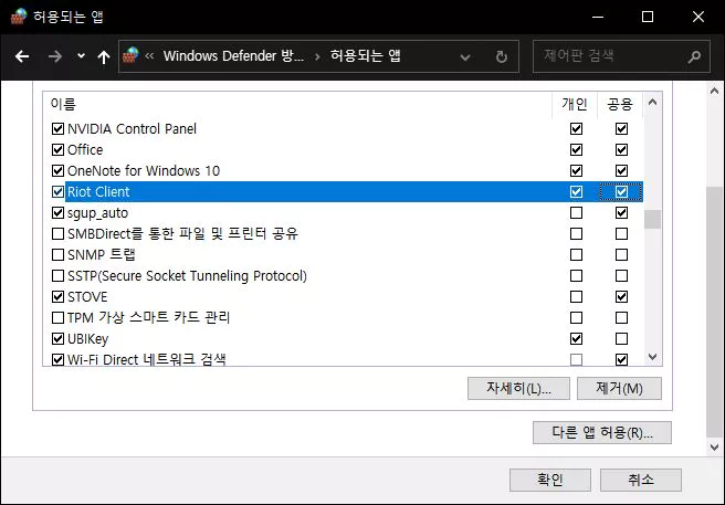 이렇게 하면 허용되는 앱 목록에 Riot Client가 들어가 있는 것이 보입니다. 라이엇 클라이언트의 개인과 공용 모두에 체크 표시해 줍니다.