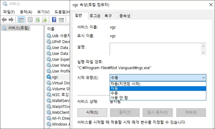 vgc 항목을 우클릭한 다음 속성을 클릭합니다. 속성에서 자동으로 설정한 다음 적용을 누릅니다.