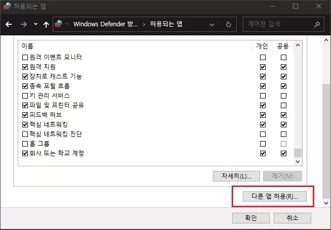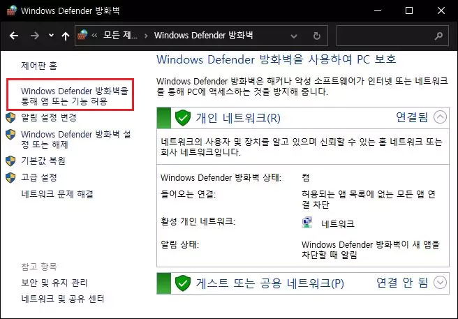 - 방화벽 설정에서 윈도우 디펜더외에 추가로 사용하는 앱이 있는 경우