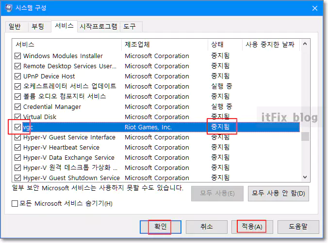 vgc 서비스 항목을 찾아 중지됨으로 선택되어 있는 상태에서 적용 버튼을 누르고 확인을 눌러 줍니다. 적용버튼이 비활성화 상태일 경우에는 vgc 앞의 체크 표시를 해제했다 다시 체크하면 활성화 됩니다.