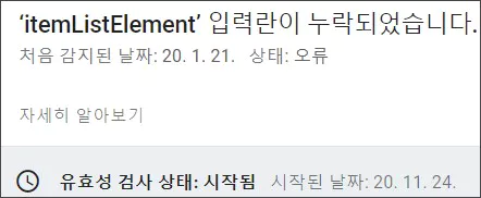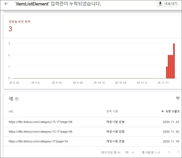 그러나 제 경우는 기존 메인 카테고리에 글이 상당히 많이 이미 발행되어 있었고 ‘itemListElement’ 오류에서 지목하는 카테고리가 바로 이 카테고리였기 때문에 글이 없어서 발생한 오류로는 볼 수 없었습니다.