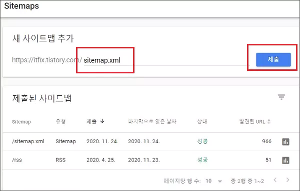 구글 콘솔의 sitemap 항목에서는 티스토리에서 했던 방식과 유사하게 동일 경로의 사이트맵을 한번 더 제출해줍니다. 이렇게 하면 초기화와 비슷한 효과를 거두면서 실질적으로는 동일한 내용일 것이므로 부담 없이 진행해 주었습니다.