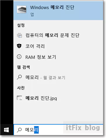 윈도우 작업 표시줄의 검색창에 메모리라고 입력한 다음 Windows 메모리 진단을 클릭하고 검사를 진행합니다. 이 검사로 메모리의 오류가 수정될 수 있으며 심각한 손상이 있는 지의 여부도 확인할 수 있습니다. 다소 시간이 걸릴 수 있습니다.