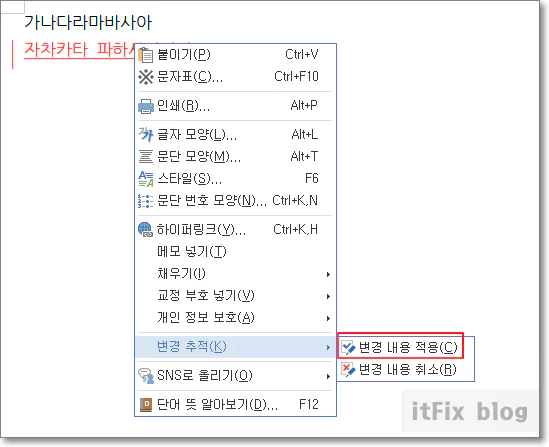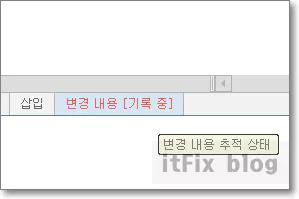 변경 내용 기록을 중지한 상태에서도 빨간 글씨로 보이는 줄을 마우스로 클릭한 다음 우클릭하면 변경 추적이라는 메뉴가 보입니다.