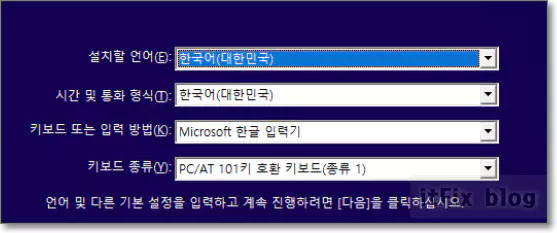 윈도우 설치 미디어가 필요합니다. 윈도우 설치 미디어를 통한 부팅 및 설치 시작 후 언어 설정 화면이 나오게 됩니다.