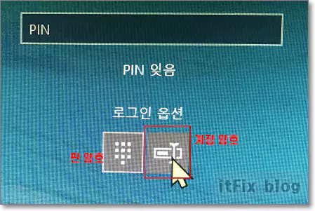 로그인 옵션이라는 글씨를 누르면 아래쪽으로 두개의 아이콘이 나오는 데 아래의 이미지에서 왼쪽 것은 핀번호 아이콘이며, 오른쪽 것은 계정 암호 아이콘입니다.