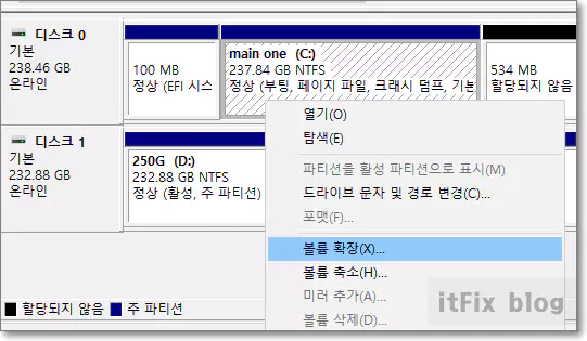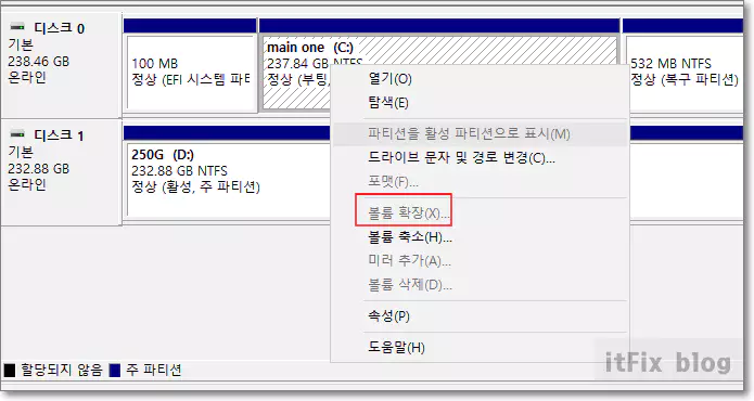 C드라이브를 우클릭해 보면 아까와는 다르게 볼륨 확장 메뉴가 활성화되어 있는 것이 보입니다.