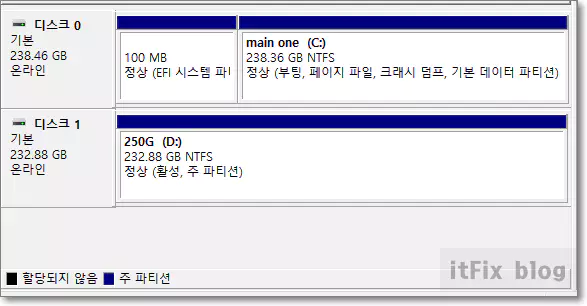 이제 복구 파티션이 검은색으로 표시되는 할당되지 않은 영역으로 변한 것이 보입니다.