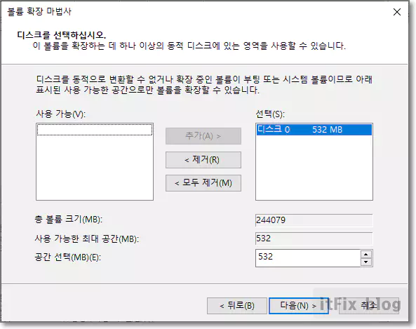 그럼 볼륨 확장 마법사가 시작되는 데, 여기에서 좀 전에 새로 추가된 기존 복구 파티션이었던 영역뿐만 아니라 여분의 다른 파티션들도 추가하여 확장할 수 있습니다. 만약 할당되지 않았던 파티션이 더 있었다면 아래의 이미지에서 처럼 복구 파티션의 영역이었던 532메가 보다 훨씬 큰 용량을 확장할 수 있을 것입니다.