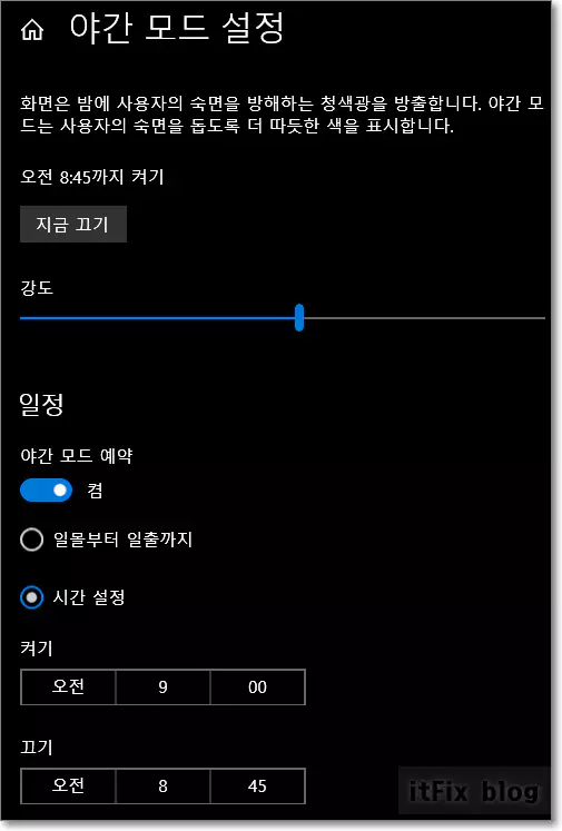 저는 시간을 오전 9시에 켜서 다음 날 오전 8시 45분에 꺼지도록 설정하였습니다. 아쉽게도 전일 설정이라는 옵션이 보이지 않아 하루 중 오전 15분 동안은 야간 모드가 적용되지 않습니다.