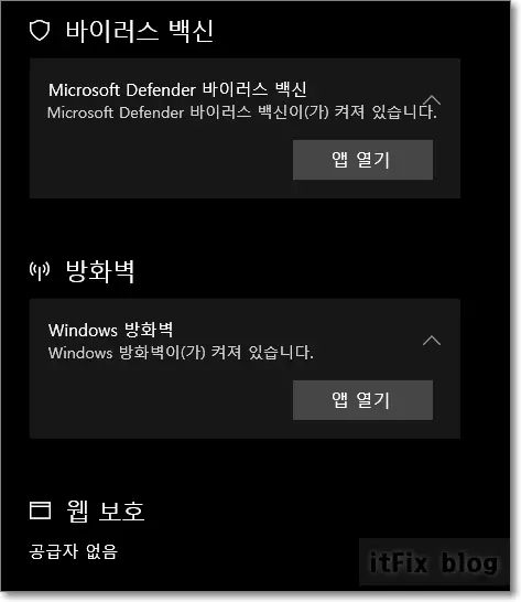 바이러스 백신 공급자를 선택하거나 설정할 수 있고, 방화벽 열기를 클릭해 디펜더 방화벽을 끌 수도 있습니다. 또한, 웹에서 이루어지는 웹 보안 앱들을 선택하거나 설정할 수 있습니다.