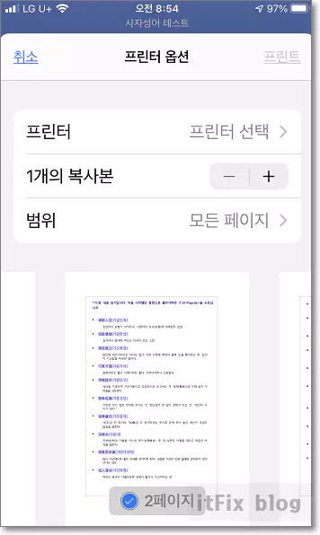 인쇄 메뉴를 터치하면 연결될 수 있는 프린터가 없는 상태이더라도 프린터 옵션 창이 팝업 됩니다.