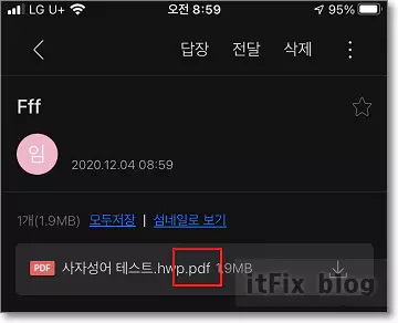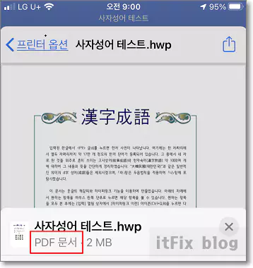 내보내기 할 앱이나 상대방을 정한 다음 전송하면 상대방은 hwp가 아닌 아래의 이미지와 같은 인쇄된 pdf 파일을 받게 됩니다.