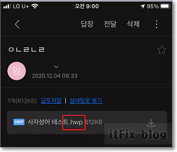 이 테스트를 위해 PC에서 다음 메일을 통해 아이폰에 테스트용 hwp 문서 파일을 내게 쓰기로 전송했습니다. 아래의 이미지는 아이폰의 다음 메일 앱에서 PC에서 보낸 hwp파일을 다운로드하는 모습입니다.