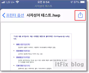 위의 화면에서 두 개의 손가락으로 아래쪽에 있는 문서 미리 보기 화면 영역을 벌려서 확대하면 오른쪽 상단으로 내보내기 아이콘이 생성됩니다.