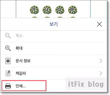 우측 상단의 한자의 석삼자 모양을 터치하면 아래쪽으로 메뉴가 올라오는데 그중에서 인쇄 메뉴가 보입니다.