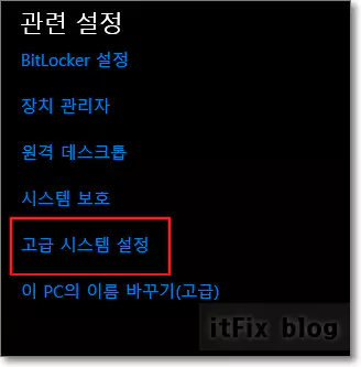 시스템 정보 오른쪽의 내용창에서 아래로 내리면 관련 설정 항목에서 '고급 시스템 설정'이 있으며 이 글씨를 클릭하여 들어가면 됩니다. 작업 표시줄의 검색창에 '고급 시스템'이라고 입력하여 들어갈 수도 있습니다.