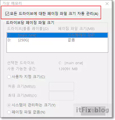 가상 메모리 설정 창에서 '모든 드라이브에 대한 페이징 파일 크기 자동 관리' 옵션이 선택 체크되어 있어야 합니다. 선택되어 있지 않다면 체크 표시를 해주고 난 다음 PC를 재시작해야 적용됩니다.