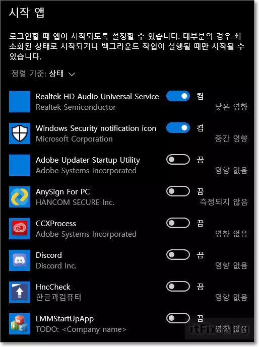이 옵션을 조정하는 작업은 예전에는 주로 MSCONFIG를 로딩한 다음 작업 관리자로 들어가서 시작 프로그램 그룹을 사용 안 함으로 설정하는 방법을 사용해서 설정했지만 현재는 시작 앱 설정에서 편리하게 설정이 가능합니다. 시작 앱 관리는 생각날 때마다 정기적으로 해주는 것이 좋습니다.