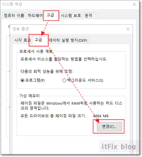 위의 성능 옵션 창에서 고급 탭을 클릭하고 가상 메모리 항목의 변경 버튼을 클릭합니다.