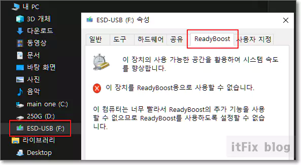 속도가 비교적 빠른 USB 메모리를 USB 포트에 삽입한 다음 파일 탐색기에서 USB 드라이브를 우클릭하여 속성을 선택합니다. USB 메모리의 속성 창에서 ReadyBoost 탭을 선택해 이 옵션을 활성화하면 PC의 성능을 개선할 수 있지만 하드 디스크가 HDD가 아닌 SSD(반도체 드라이브)인 경우에는 이 옵션을 사용할 수 없습니다.
