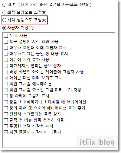 성능 옵션 창이 열리면 먼저 최적 성능으로 조정을 선택하여 모든 윈도 꾸미기용 옵션들을 제거합니다. 이렇게 모두 제거된 상태에서 사용하는 것이 가장 좋지만 꼭 켜 두어야 할 옵션이 있다면 이 상태에서 해당 옵션만 선택합니다.