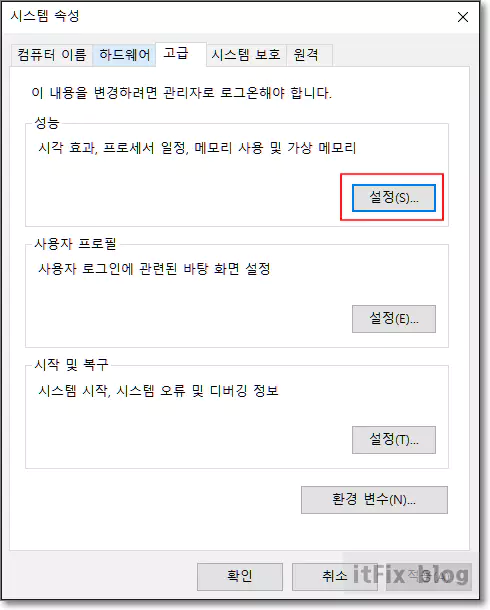시스템 속성 창이 열리면 고급 탭의 성정 항목에서 설정 버튼을 클릭합니다.
