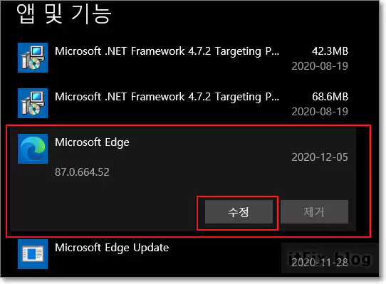경로는 윈도우 설정 > 앱 > 앱 및 기능에서 엣지 아이콘을 우클릭한 다음 수정 버튼을 눌러 줍니다.