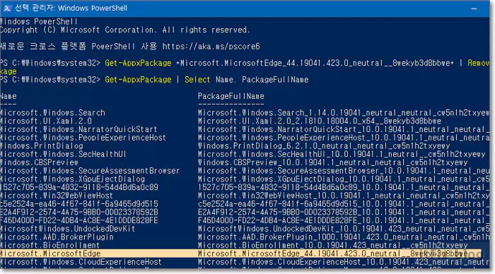 위의 명령어를 통해 현재 윈도 버전에서의 엣지 이름을 알아낼 수 있습니다. 파워셀에 붙여 넣기 한 다음 엔터 하면 현재 엣지의 이름은 Microsoft.MicrosoftEdge_44.19041.423.0_neutral__8wekyb3d8bbwe 이라고 나오고 있습니다.