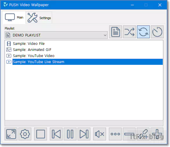 메인 탭에서는 비디오 바탕 화면의 플레이 리스트를 조정할 수 있습니다. 비디오 바탕 화면 앱에서 작동시킬 수 있는 형태는 크게 4가지 형태입니다.