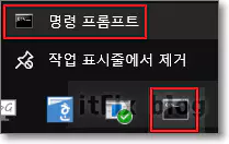 작업 표시줄에 있는 CMD 아이콘을 마우스 우클릭한 다음 명령 프롬프트 라는 글씨 위로 마우스 커서를 가져갑니다.
