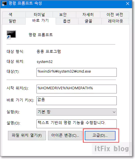 속성창이 열리면 바로 가기 탭에 있는 고급 탭을 클릭합니다.