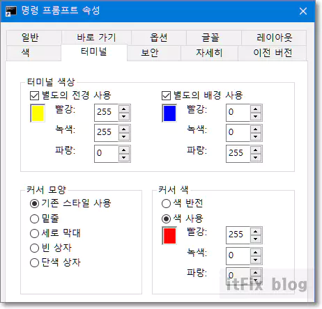 부가적으로 좀전의 명령 프롬프트 속성 창에서 터미널 탭을 선택한 다음 자신의 입맛대로 배경 색상이나 폰트 색상 등을 변경할 수 있습니다.
