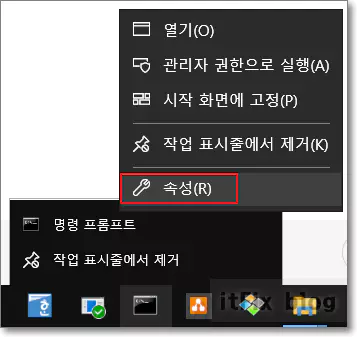 다시, 명령 프롬프트라는 글씨에서 우클릭한 다음 속성을 누릅니다.