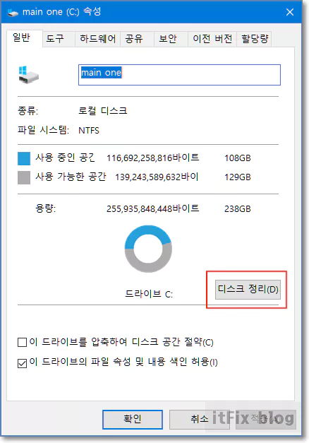 파일 탐색기를 열고 디스크 정리(주로 윈도우가 설치된 C드라이브를 정리합니다)를 할 드라이브를 선택한 다음 마우스 우클릭하여 속성을 선택합니다. 드라이브 속성 창이 열리면 디스크 정리 버튼을 눌러 정리 작업을 시작합니다.