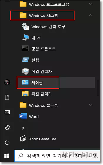 어쨌든, 작업 표시줄에 제어판 아이콘이 보이지 않을 경우에는 작업 표시줄의 좌측 끝에 있는 윈도우 로고를 클릭하면 설치 중인 프로그램 목록의 바로가기 들이 팝업 됩니다. 마우스 휠을 이용해 아래로 내리면 Windows 시스템 항목이 보이고 이 항목을 열면 제어판 바로가기 아이콘이 보입니다.