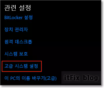 이 정보창을 옆에 붙어 있는 스크롤 바를 아래로 내려 보면 관련 설정 항목에 '고급 시스템 설정'이라는 글씨가 보입니다. 이 글씨를 클릭하면 '시스템 속성' 창이 열리게 됩니다.