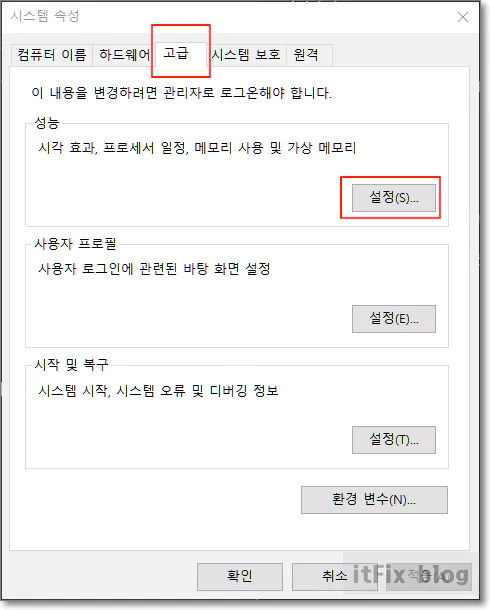 시스템 속성 창에서는 다들 아시다시피 가장 중요한 최적화 설정인 성능 설정을 할 수 있습니다.