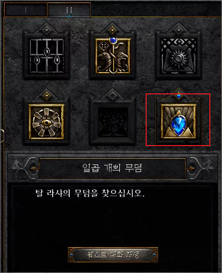 ACT2의 마지막 퀘스트 이름은 '일곱 개의 무덤 - 탈 라샤의 무덤을 찾으십시오'입니다.
